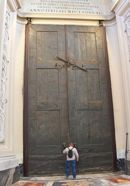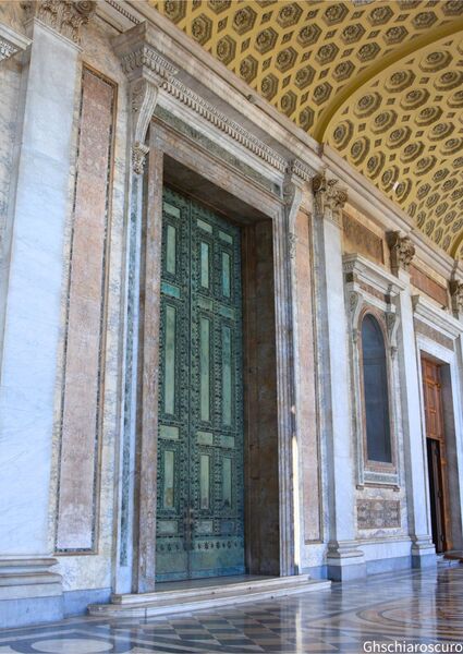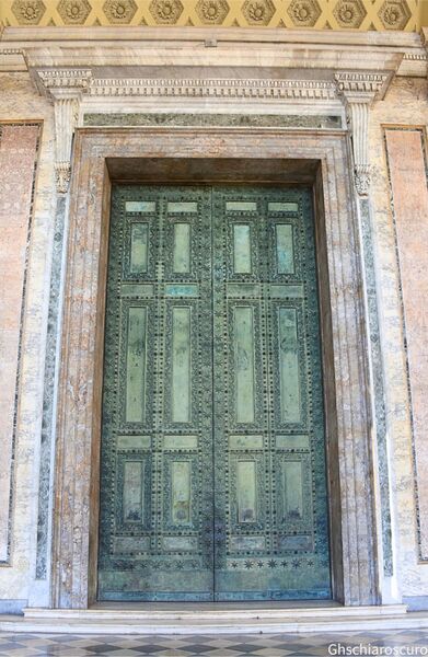 教堂中央的青銅大門大有來頭,原來是位於古羅馬廣場的元老院議事堂(Curia)大門,推測是西元一世紀羅馬皇帝圖密善時期鑄造的。這件將近有兩千年歷史的珍貴古物,是現存羅馬最古老的銅門。