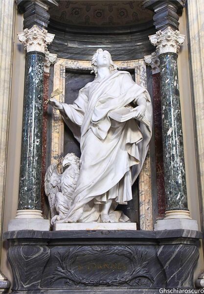 手上拿著福音書,腳下有一隻鷹,代表他是約翰福音作者。