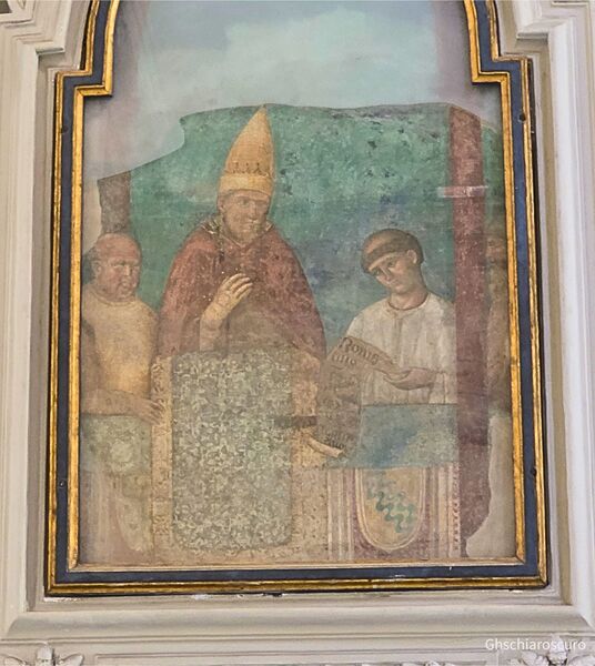 ▼著名畫家喬托(Giotto)也是1300年朝聖者之一,為紀念此一此歷史事件,喬托以教宗在拉特朗聖若望大殿昭告禧年為主題畫了一幅壁畫,目前原畫僅局部留存下來。這個斑駁的濕壁畫狀況不佳,表面以透明玻璃罩住,展示在中殿墩柱上。