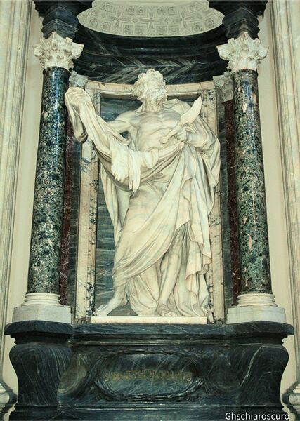 左手拿著一把匕首,右手拿著從左肩垂下來的被剝下的自己人皮。上半身寫實的刻畫出被剝去皮膚後裸露出來的肌肉線條,被認為是中殿裡是最具戲劇性張力的雕像。