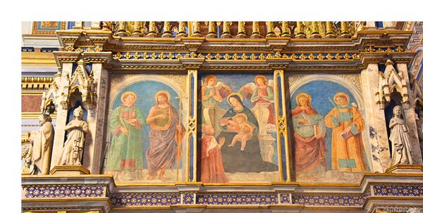 第二層柱頂簷部橫飾帶上有12幅濕壁畫,是Barna da Siena在西元1369年畫的,他與設計華蓋的建築師同樣來自西恩那。這是羅馬少見以壁畫裝飾的祭壇華蓋。