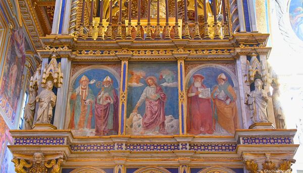 教堂後殿半圓形室上的壁畫是一座教堂最神聖的圖像,其繪畫內容代表這座教堂的定位。除主角耶穌,以及常出現的聖母、聖伯多祿與聖保祿外,教堂紀念的聖人也會出現在壁畫中。