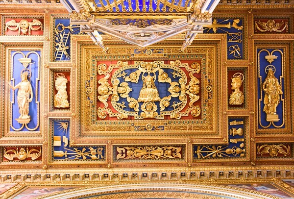 ▼袖廊的木製格狀天花板也是della Porta設計的,他的設計參考中殿天花板,因此兩者外觀極為相似。天花板正中央是耶穌像,兩側是聖伯多祿與聖保祿,再外側是施洗者聖若望與福音書聖若望。拉特朗聖若望大殿是紀念兩位聖若望的教堂,因此兩者的圖像出現頻率很高。
