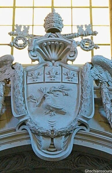 ▼門廊屋頂正中央標示著委託建造立面的教宗克萊孟十二世牧徽。