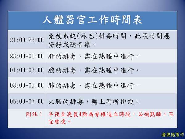最近收到了朋友傳來的一份「器官工作時間表」,根據原蘇聯科學家費洛諾夫研究發現身體各部門的器官都有自已的工作時間,特別是晚上11點至凌晨1點,這段時間是肝臟需要在熟睡之中進行排毒,相信在此時段的我們,不是在追劇,就是在熬夜、加班、拼經濟,因此熬夜的行為也稱之為「爆肝」一點也不為過。