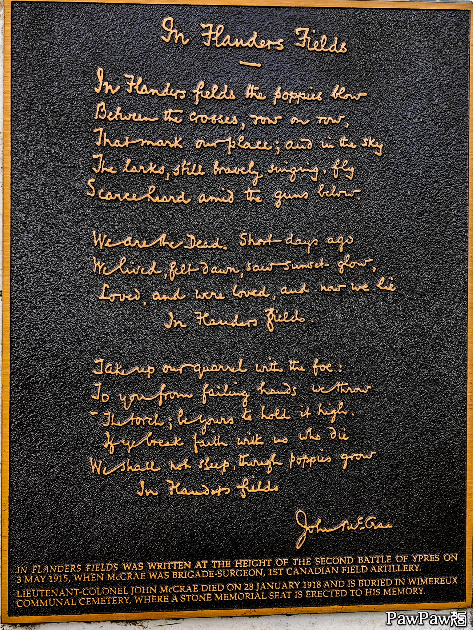 這首名為“於法蘭德斯之田野 ”詩是加拿大軍醫約翰 麥克雷於110年前的5月3日因感念戰死的同袍而寫於比利時伊珀爾的戰場。在伊珀爾郊區麥克雷曾經駐守的工事旁有著加拿大政府立的紀念碑,今天這照片就是碑上複製這首詩的手稿。可嘆的是這詩的作者自己也沒能活到戰爭結束而死於當時戰地常見的肺炎。