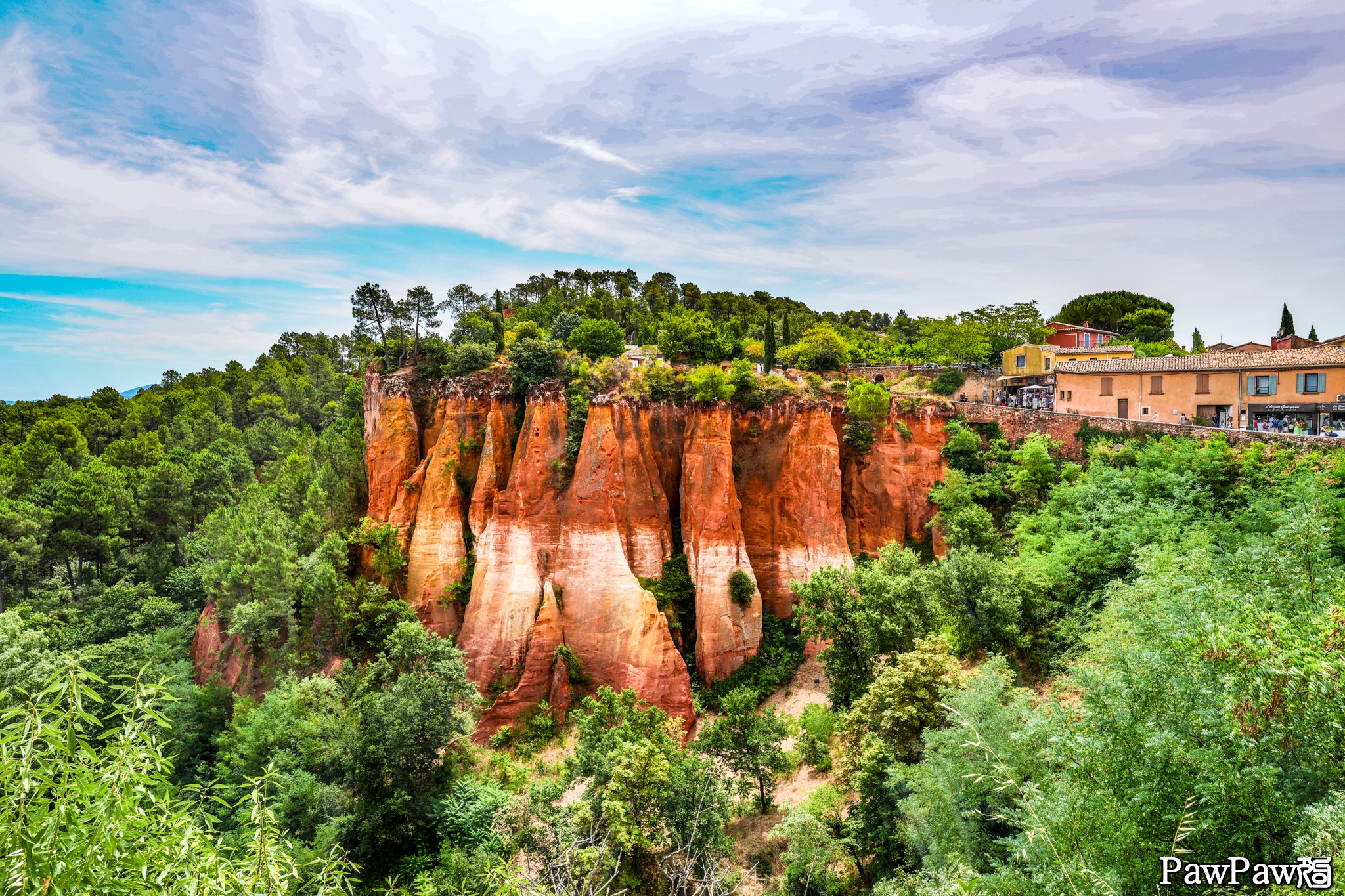 話說這天貓狗穿過比車子沒寬多少的窄巷後,突然不僅就到了魯西永這小鎮最大街道而且就正面對著這小鎮的最有名的赭色柱形峭壁。當然,要在這附近找停車位可不容易,最後是沿著這“大街”將近到村口才有個規模稍大給遊客的付費停車場。從這走回到鎮中心的景點要將近一公里!這還算好的,貓狗就還看過在其他有景點的小鎮停車場都到了兩公里開外之處了。