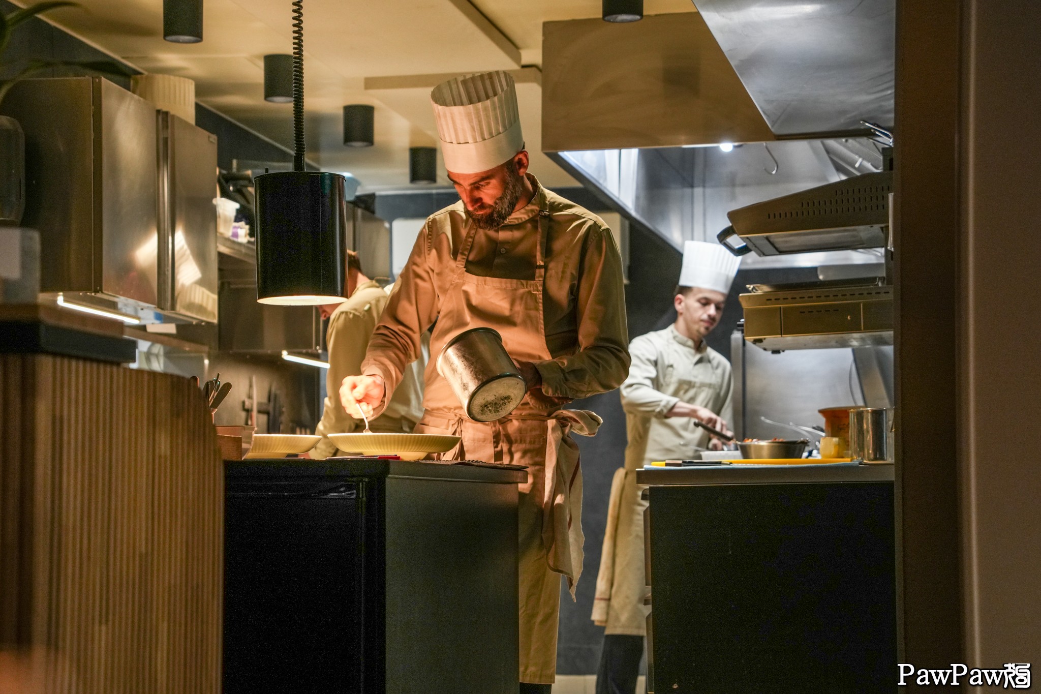 這餐廳位於一個小街上,裝潢簡潔,貓狗被安排的桌位剛好是面對廚房,雖然廚房口被服務領班的位置稍微遮擋,但仍然可稍微看到廚房的動靜,尤其是在廚房口把關的主廚。今天照片裡就是這米其林一星餐廳的主廚在出菜前做最後的調理。一個好的餐廳主廚並不是所有的菜都有親自動手,而是要確定所有端出廚房菜色的品質。一個好的餐廳主廚會適時的出來與每桌客人打招呼,從客人的反饋可以了解需要改進之處。這位主廚的做法是會親自為每一桌上一道菜。