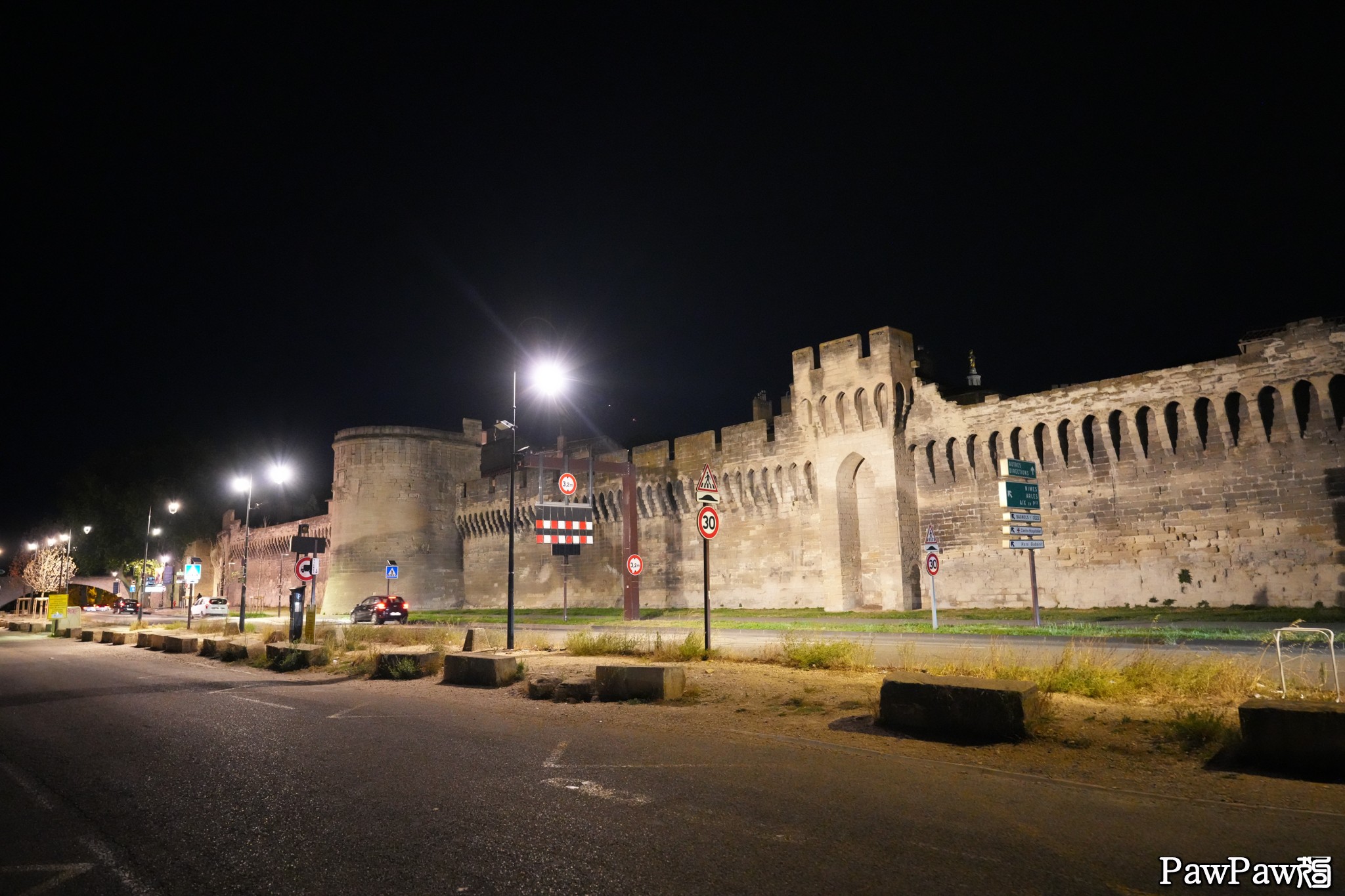 話說貓狗這天在法國亞維農老城區內一家米其林一星餐廳用完晚餐後,沿著河邊往貓狗住的河上旅館前進。馬路對面就是亞維農的城牆,從照片中車子的比例就可看出這城的城牆有多高。以14世紀的人力物力來說,如果不是因為教廷遷移至此,即使這城在當時算是處於河道交通要地,也很難想象會見如此規模的城牆。不僅如此,在河對面也還有一座相當龐大的要塞有夾擊防守河道的作用。