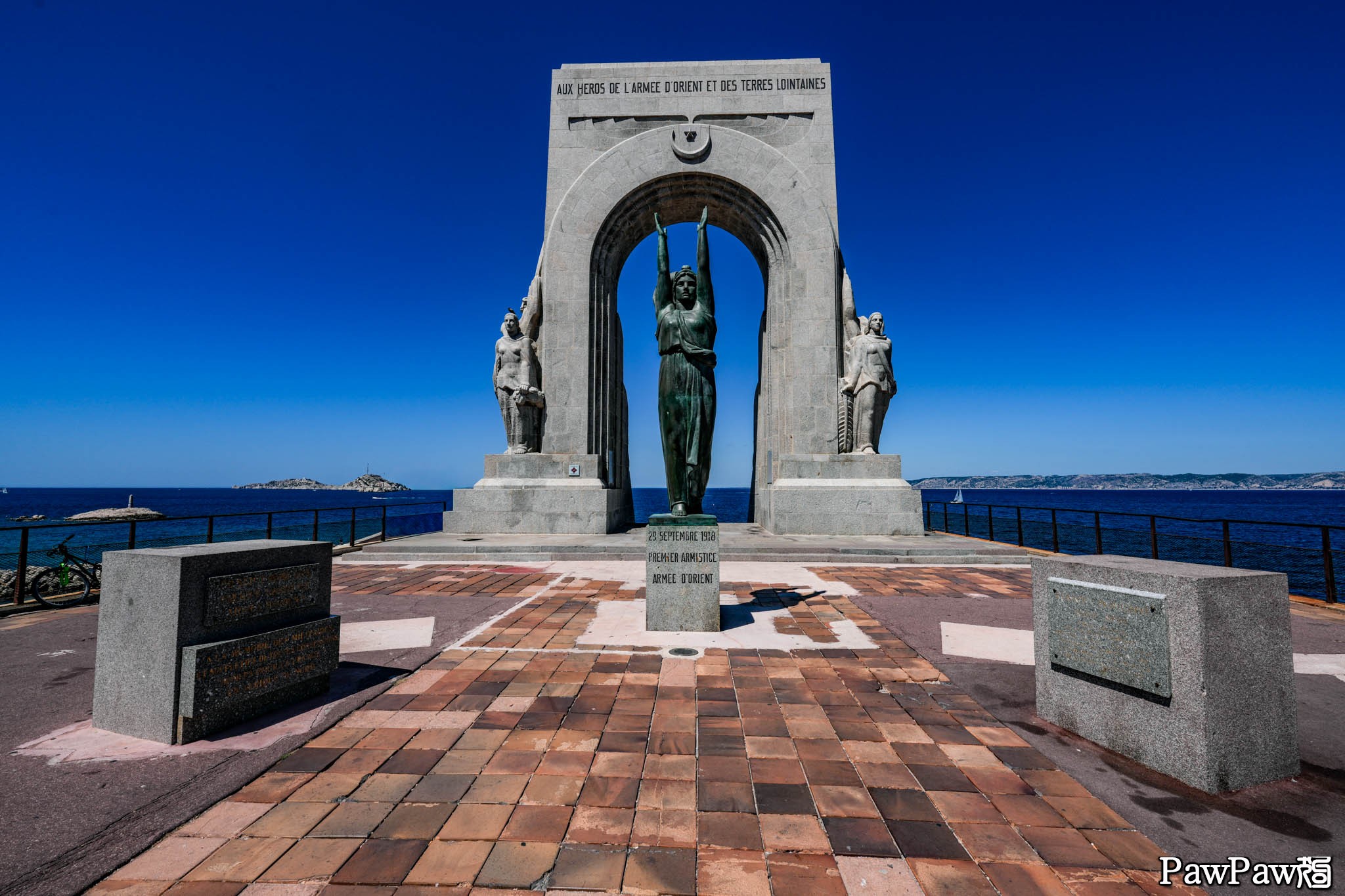話說貓狗去年才到過馬賽,所以原本這次到馬賽只打算待一晚,主要就是去那家米其林三星餐館,之後就打算北上,最終當然是回到日內瓦搭機回家,結束此次南法之旅。可是覺得這次馬賽旅館的有景之房不錯就又延了一天。既然如此隔天就搭了那個83號公車到了海岸旁的這座一戰紀念碑。從這可觀賞馬賽還不錯的海岸線,包括離岸不遠,小有名氣的監獄島伊夫堡。大仲馬的小說基督山恩仇記裡就以這監獄島為背景。這島可從老港搭渡輪前往,貓狗之前已經去過,這次就換個角度來觀看。
