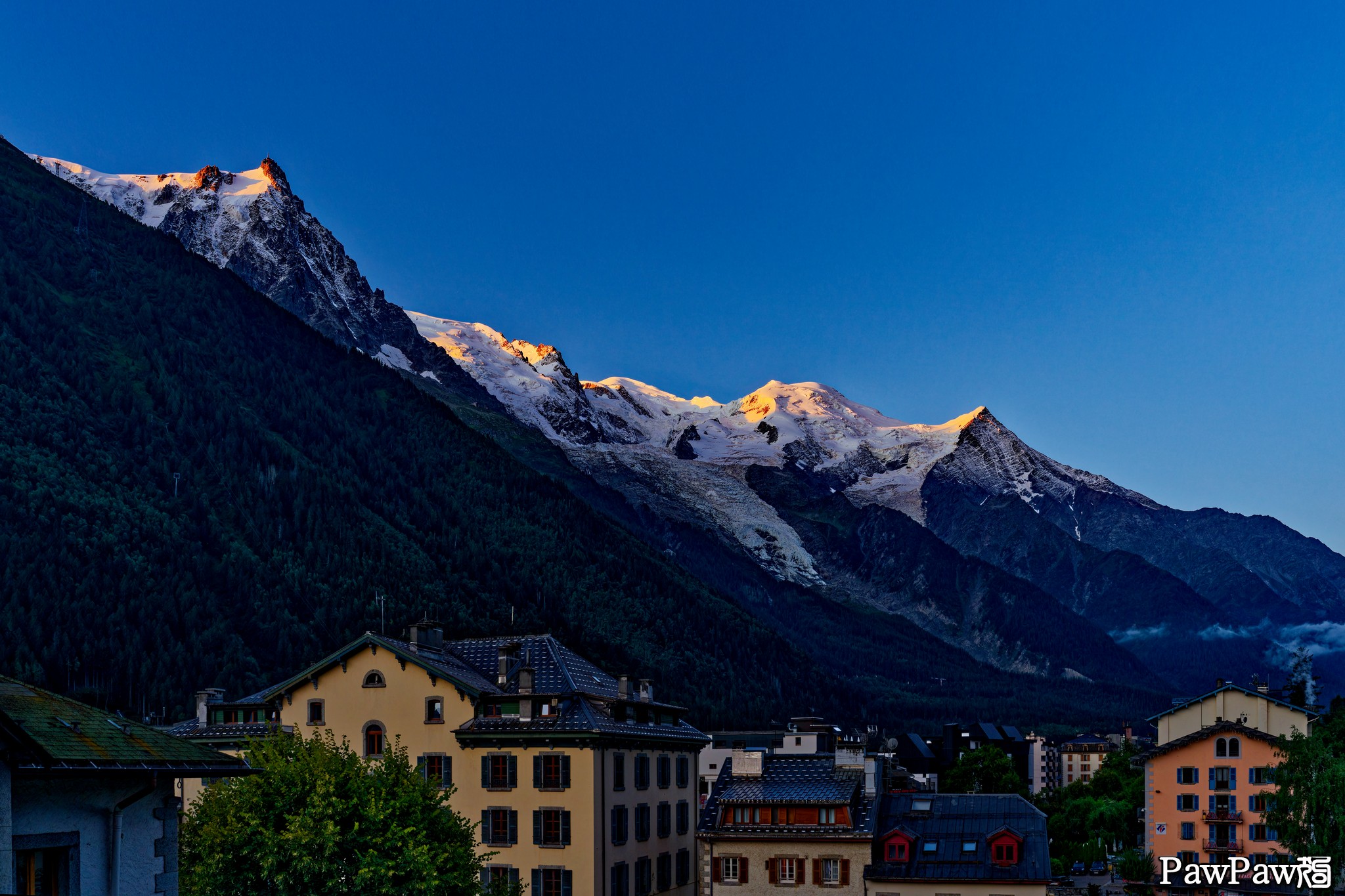 話說貓狗原本沒打算留宿於霞慕尼,因為大狗不想晚上開山路,找了家不起眼而且房間也不咋樣但是有停車位的旅館,結果意外發現房間不但有景而且白朗峰山脈就在眼前。雖然傍晚入住時山頂有雲無法見到山峰,但金光燦爛正是夕陽無限好。