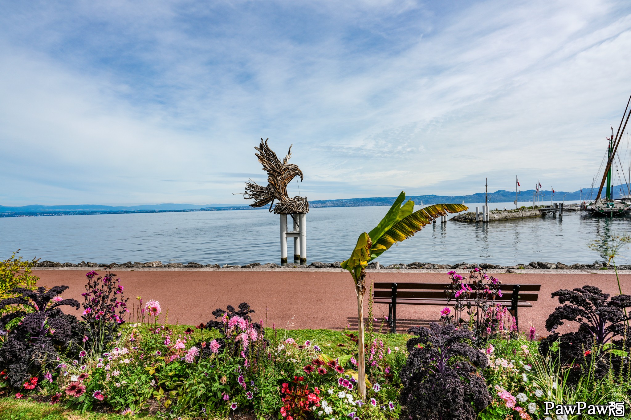 話說這天貓狗搭了渡船在法國的依雲與瑞士的洛桑之間過了個來回之後,還有點時間就沿著湖邊逛了一下。在依雲有許多看似用樹枝扎起來的塑像。像這個在渡船碼頭旁的老鷹就是個例子。也不知道這些塑像的樹枝是經過處理還是陸續有在抽換維修,總之這些樹枝扎出來的塑像和記憶裡幾年前的樣子沒有什麼不同,似乎挺能經得住氣候及歲月的考驗。