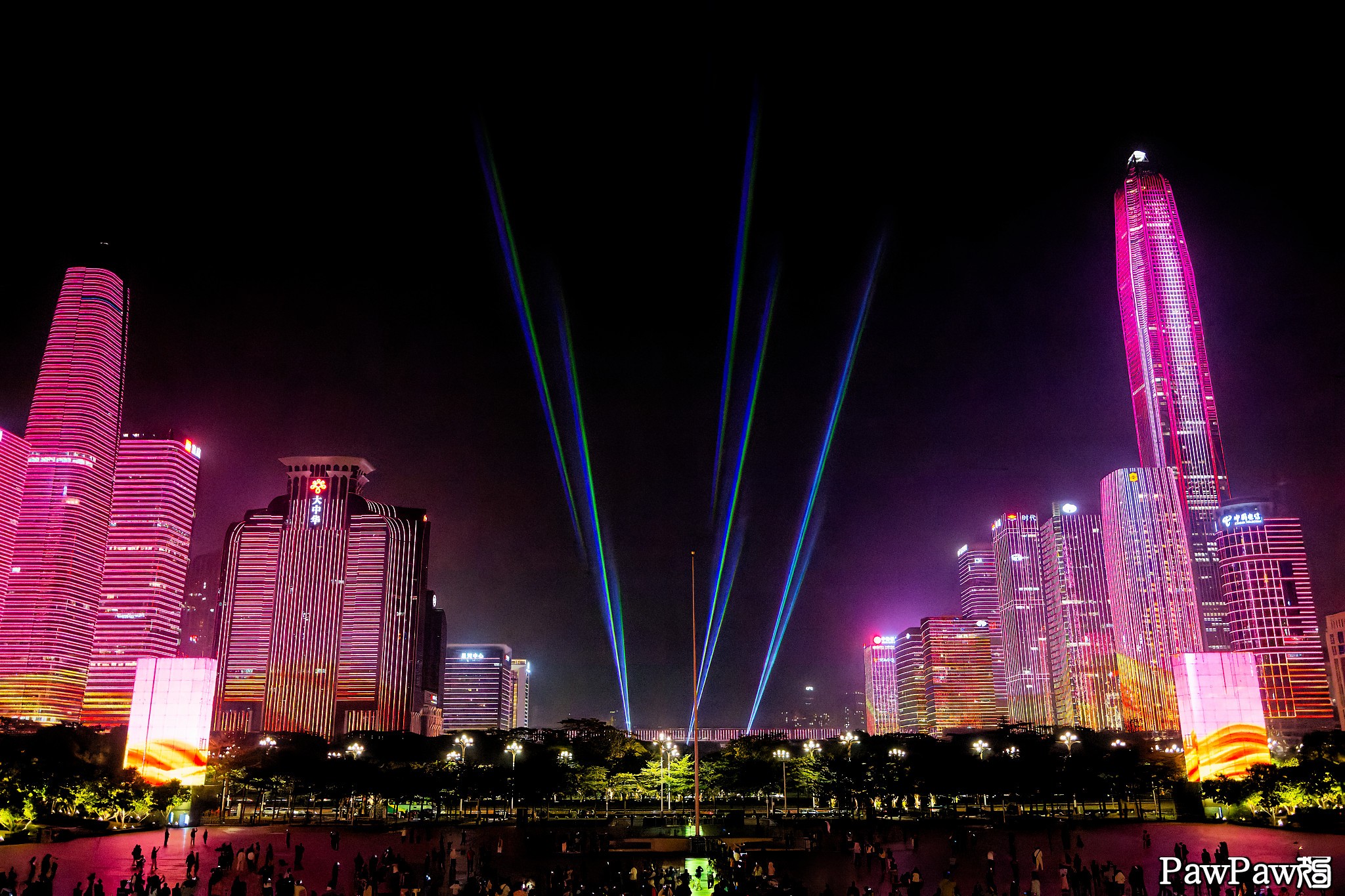現代的大樓燈光秀因為新建整個區塊的大樓不僅外牆面都設有燈光設備,而且附近的大樓群的燈光還可連動控制,可以形成大型的屏幕。這不像在老建築上要做燈光秀就只能用投影的方式,其效果不僅光暗而且因為歐洲老建築外牆都是不規則而導致效果不好。貓狗多年前就在大冷天的晚上在瑞士國會大廈外領教過。當時一晚兩場,第一場竟然因投影機故障而取消,而第二場不僅看了大失所望,而且整個廣場人擠人秩序完全失控,如果當時有什麼恐慌事件發生,後果是不堪設想。相對來說深圳這晚在制高點就設有現場指揮台,不僅場內人數受到管控,若有突發事件也能應對。