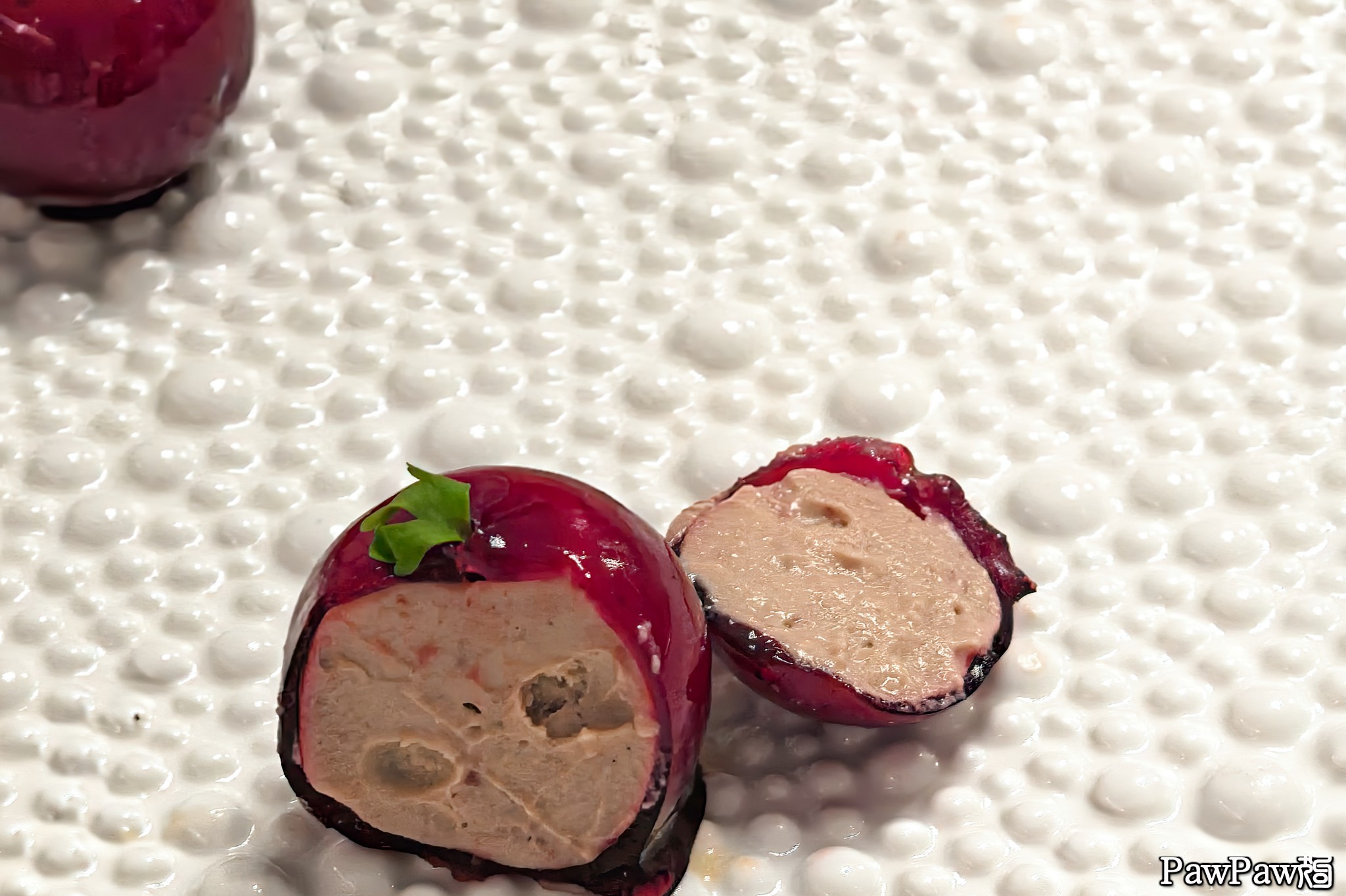 上來的第一到開胃菜就是照片裡的櫻桃鵝肝。這道菜乍看下還真像櫻桃。切開看是用櫻桃醬為皮包裹著鵝肝,這種搭配不僅賣相好,口味的搭配也極佳,尤其是鵝肝能做到如此細膩入口即化卻回味無窮,即使在法國一星級餐廳都不多見。後來貓狗在廣州另一集團理論上更高級旅館餐廳也點了類似的櫻桃鵝肝,不論賣相或口味都遠不如這家。這天的幾道菜不僅在創意賣相及口味都遠超貓狗意料,要比許多貓狗吃過的米其林一星的餐館還更勝一籌,可這餐廳竟然連米其林砸招牌的所謂推薦都不是,而廣州那家貓狗偷工減料貓狗再也不會去的餐廳,竟然還是米其林推薦,所以大狗常覺得米其林的招牌不過如此。