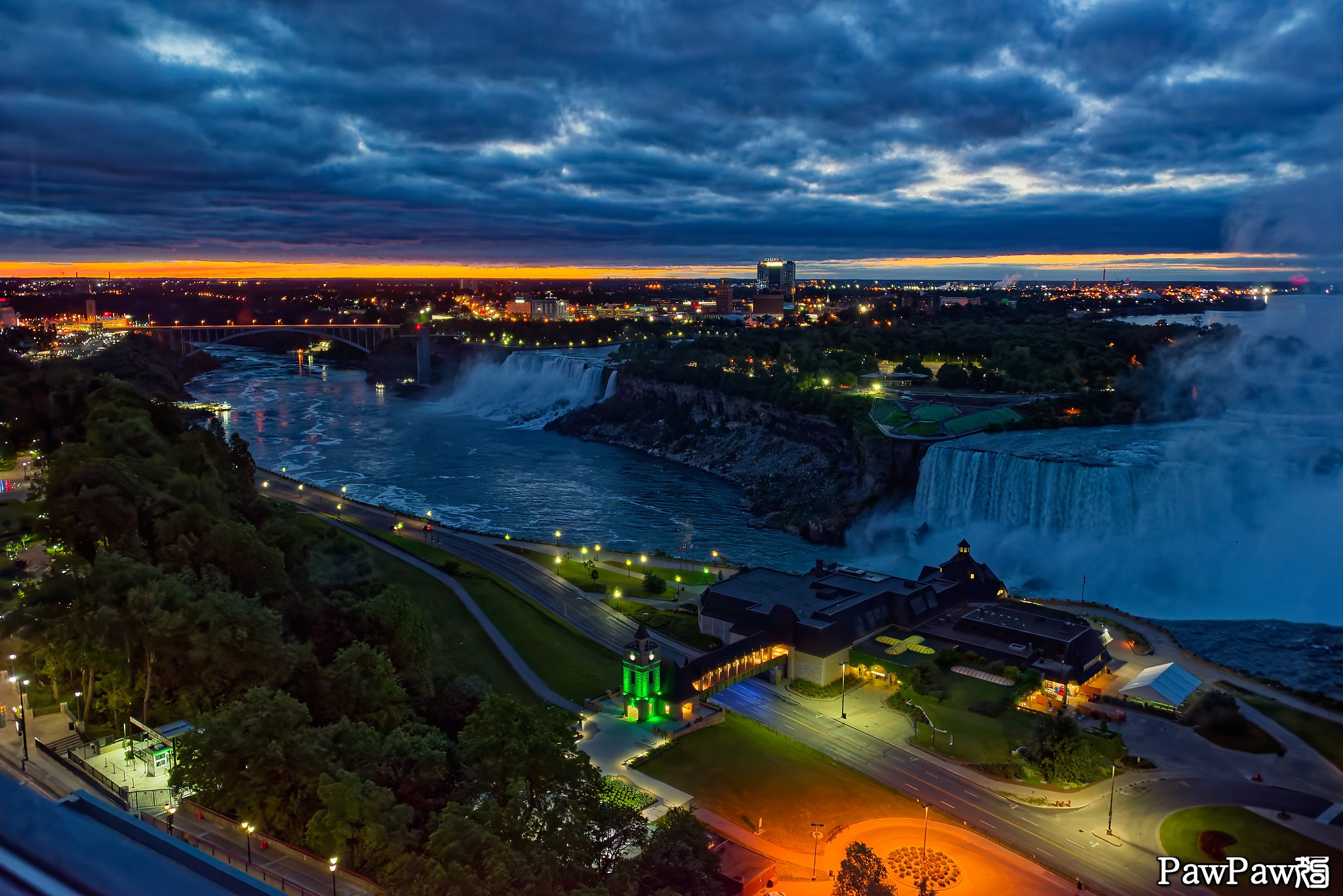 曙光初現下的尼加拉大瀑布。照片上河的上方是美國而下方則是加拿大。現今兩國的關係怕是恰與照片的日出曙光相反的進入黑暗時代。