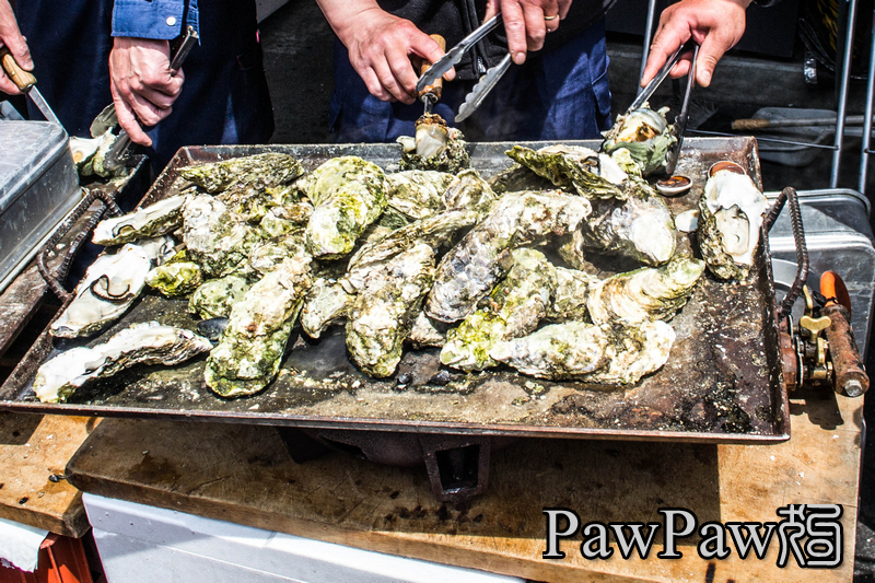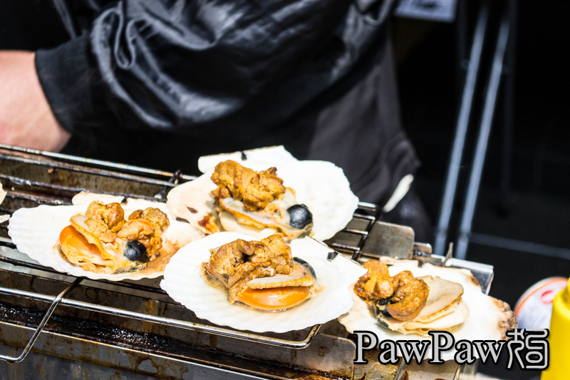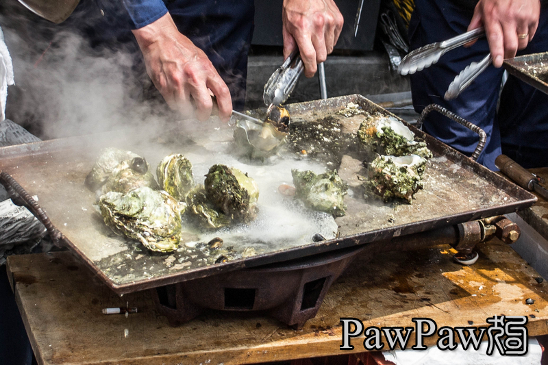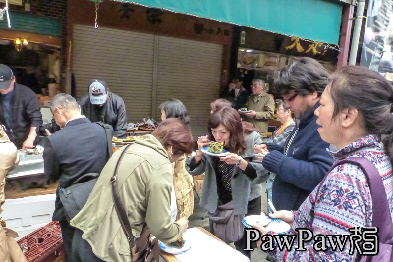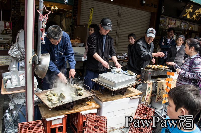 轉到一個街口突然看到一群人,有排隊的也有在吃的。仔細一看原來有個路邊攤在賣現烤的扇貝,蠔及海螺。每樣各六百日元一客。這價錢絕不便宜但等著買的人卻絡繹不絕,當然也包括了貓狗。這再度說明了若人有則我必須有的群眾心理。
