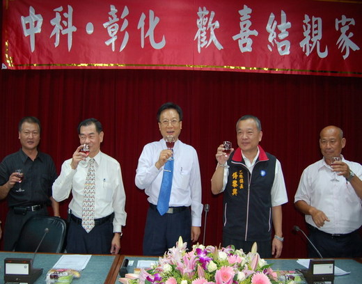 彰化縣大突破,中科四期確定選址彰化縣,彰化縣長卓伯源、二林鎮長傅黎興、竹塘鄉長蔡永稽、議員張國棟、洪和炉、洪進南、中科彰化園區推動委員會總顧問陳明德等人歡喜迎接這段良緣,21日上午在縣府簡報室召開記者會向彰化的鄉親報告這項喜訊。