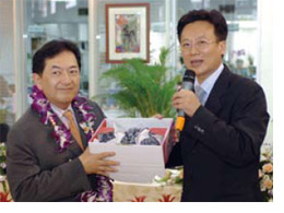雙方一番寒喧過後,田中康夫知事首先在歡迎牌上寫下「智性、勘性、溫性」富有哲理的留言並簽名留念,而卓縣長寫下「吉祥如意」、白議長則寫下「心想事成」來歡迎他們,也為兩縣的友好往來開啟一扇大門。