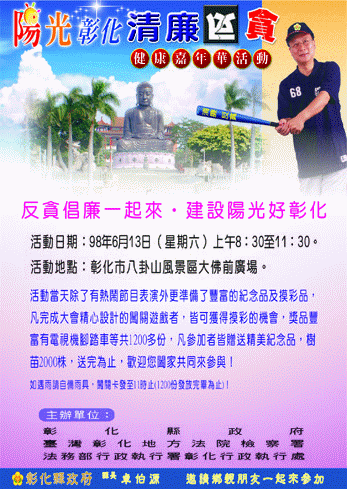 而為了有效推動「興利除弊、倡廉潔、反貪瀆」工作,彰化縣政府預定在13日(星期六)上午8時30分於八卦山大佛前廣場舉辦陽光彰化清廉反貪健康嘉年華活動,藉由政風機關、民間團體的共同合作,加強宣導縣府依法行政的廉能效率與便民觀念的推動執行成果,邀請民眾一起來參與,以落實彰化縣陽光普照清廉執政的決心。