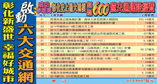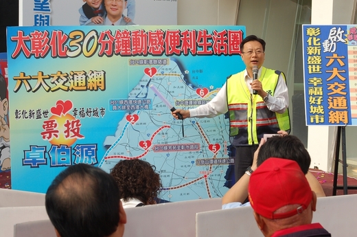 伯源要向鄉親報告,在4年縣長任內,我們陸續向中央爭取到總工程經費614億餘元的交通建設經費,這是彰化建縣286年以來,同一時期爭取到預算總額最多的交通建設投資,包括正在施工的台1線溪州橋橋基保護、和美交流道連絡道、台76線埔心交流道、台61線西濱快速公路延伸、彰南路和中彰路口立體交叉工程等;即將動工的則有台74線台中彰濱延伸、台76線福興芳苑延伸、彰130線等生活圈道路系統建設計畫、148線外環新闢工程等。