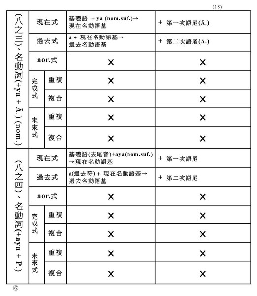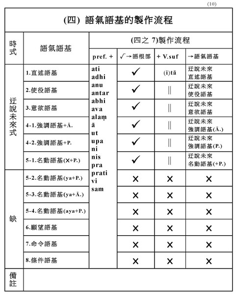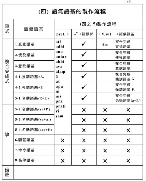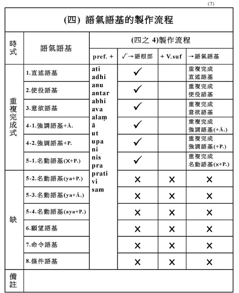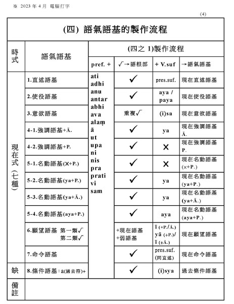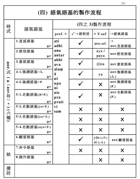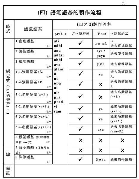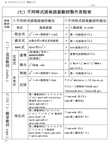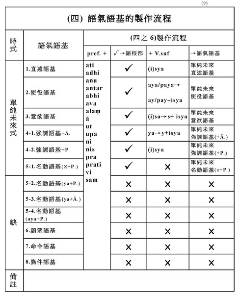 (二)製作流程:上揭 1.pref. +2.√→語根部 +3.時式語氣v.suf. → 4.時式語基v.stem. +5.(不同時式的)v.end. → 6.(不同時式的)時式語氣v.。