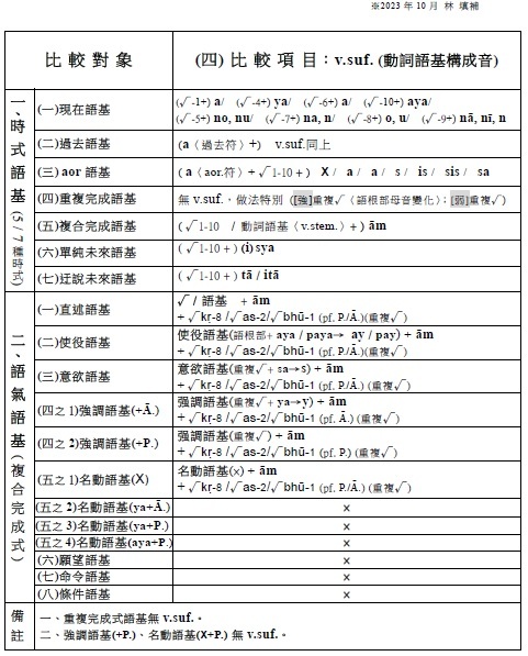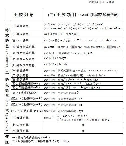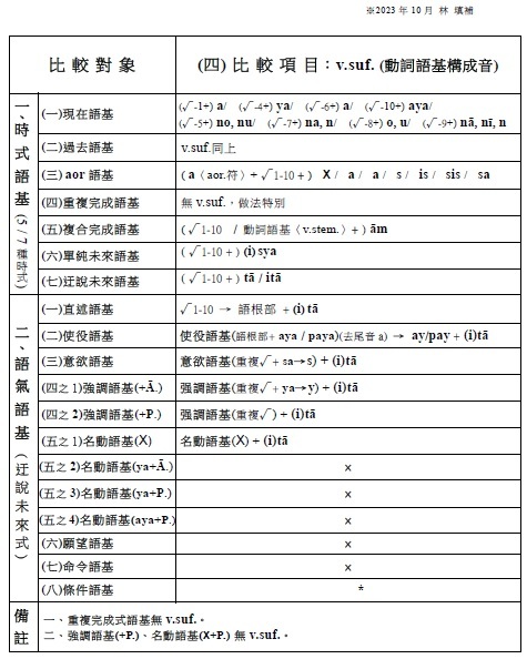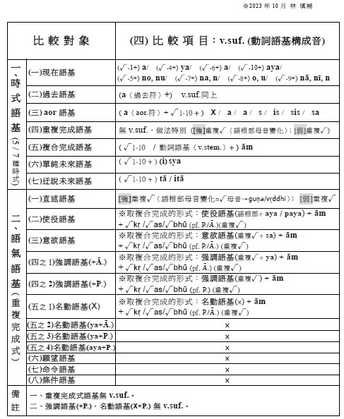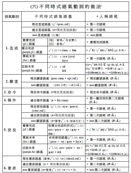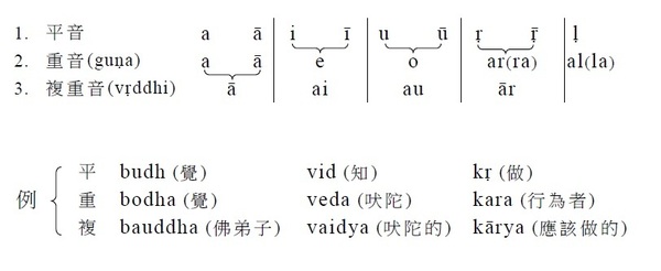 3.名詞語基構成音(pratyaya) √man + as(n.suf.) → manas(n.stem. 心)。其中as是名詞語基構成音,附加在語根後所得到的,稱為名詞語基。