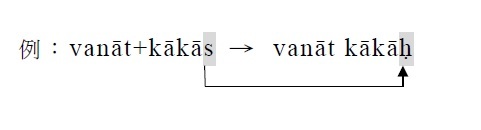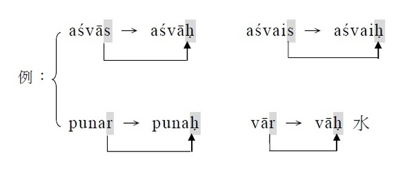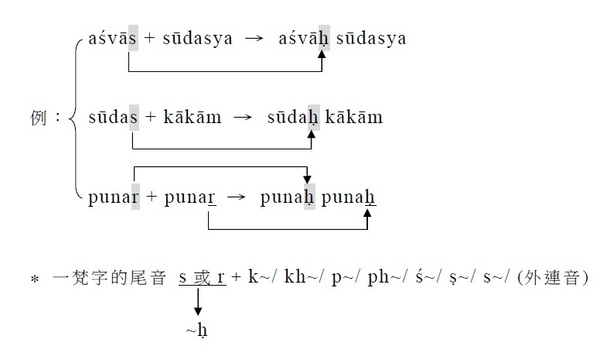 3. s/r的下一個梵字為 k/ kh/ p/ ph/ ś/ ṣ/ s/,其尾音s/r → ḥ