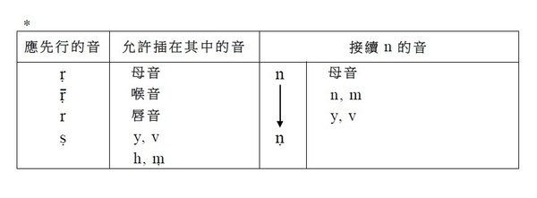 ⁎ m實際上變為ṃ音,只有在其下一個音是半母音及磨擦音,亦即y/ r/ l/ v/ ś / ṣ/ s/ h時。在其他場合,即使是寫作ṃ,實際上的發音,是變為和接著而來的子音同種類的鼻音。因此,也有學者常依實際的發音記之。