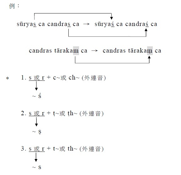 §14. 一字之末的s及r,在次字的頭音為c/ch,ṭ/ṭh,t/th時,變為ś/ ṣ/ s。