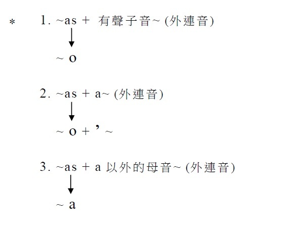 1. 接有聲子音時,變為o (~as → ~o)