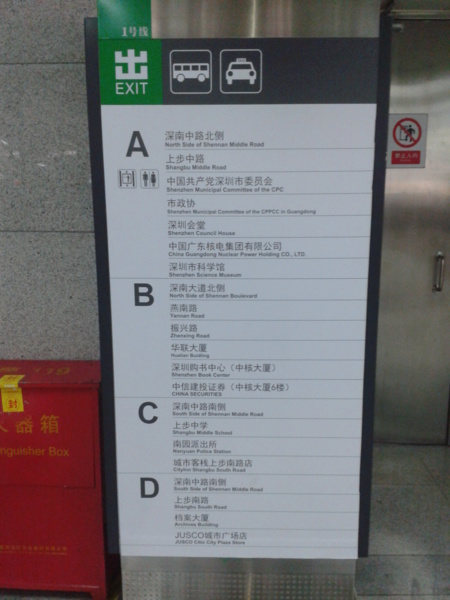 B出口是深圳購書中心,D出口有Jusco。一從地鐵從B出口出,已看到大家樂!那商場還有好幾間食肆,如近來所喜愛的薩莉亞意式餐廳!如沒有合心意的可到D出口,粉、麵、飯任君選擇!有大家樂、香港地、韓國菜館、日本菜館、打邊爐、Mcdonald 和bar一間。當然街檔仍未計算在內。