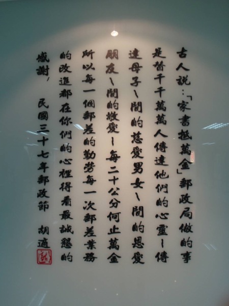 清代郵政官員配戴相當於現今工作證的木頭腰牌,非常有趣。投遞方式也從馬匹、駱駝、馬車、小舟、運船、帆船、獨輪推車、肩擔、划木盆過河、甚至背上揹袋爬單索,讓我大開眼界。如此敬業的精神,早期郵差在戰火,天災來臨也不畏懼,依然使命必達,烽火連天中的兵士們收到家書倍感安慰,但也有在戰火天災中不幸捐軀的郵務士,看完他們史蹟,倍受感動,這樣一心堅守自己崗位。
