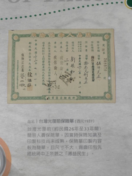 圖下為郵局開辦建議壽險之第一張保單樣式