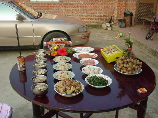 Q爸特地幫我把拜拜的一桌子菜拍了下來,看起來相當豐盛哩!