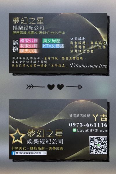夢幻之星娛樂經紀公司 我們有專業的團隊 佛心酒店經紀-阿吉 貼心酒店女經紀-可可 我們對於酒店市場熟悉度 (了解透徹) 桃園-中壢-新竹-台北 (制服店/禮服店/制禮店) 各店家的薪水/制度/客源/...