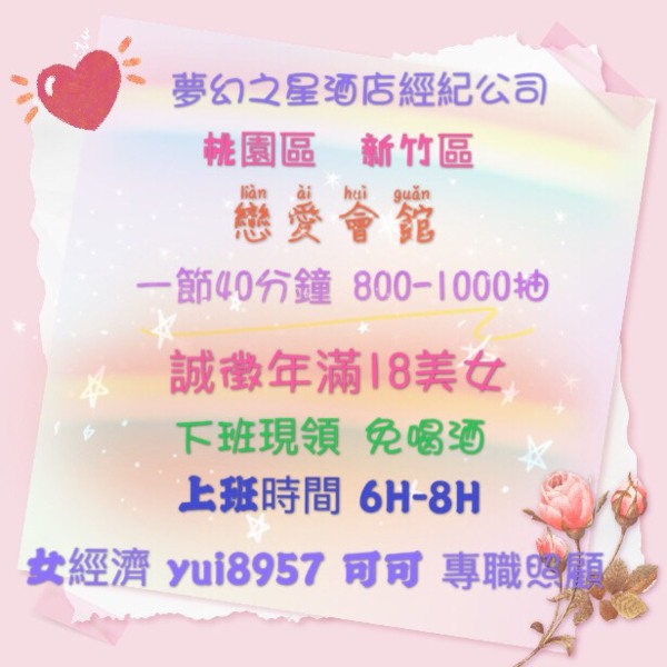 夢幻之星娛樂經紀公司 我們有專業的團隊 酒店經紀-阿吉 酒店女經紀-可可 桃園-中壢-新竹-台北-台中 (美女舒壓店/聊天戀愛會館/美女護膚店) (女傳播/飯局/伴遊/套房服務) 時薪:1H-800...