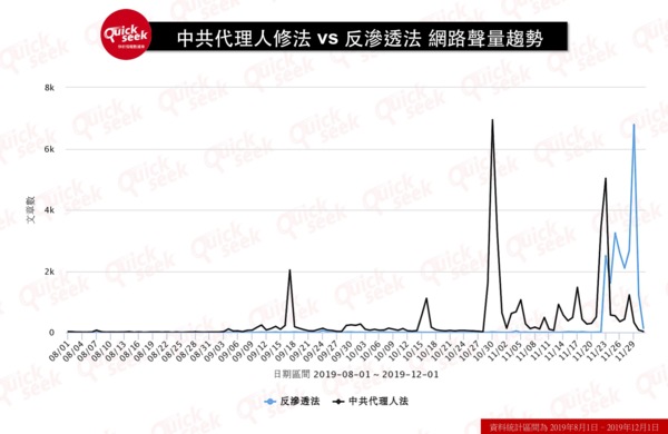 從網路聲量來看,「反滲透法」近日的討論聲量直逼「中共代理人法」的單日6,500筆討論聲量。