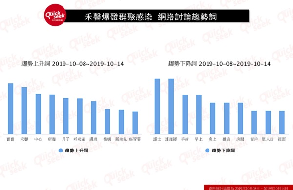 比較禾馨出包事件前後的網路討論趨勢詞也可以發現,禾馨月子中心群聚感染新聞爆發後,關於月子中心的網路熱門詞彙已與過去不同,「禾馨」、「病毒」、「呼吸道」等事件關鍵字都備受關注與討論。在此之前,月子中心相關討論詞多半是圍繞在居住環境(如單人房、聲音、房間)與照護者(如護理師)等話題。由此可見,禾馨事件爆發後的網路討論確實轉向群聚感染,許多爸媽過去可能討論應該如何選擇月子中心的房型與照顧者素質,但院方隱匿疫情的消息爆發讓其他討論銷聲匿跡。