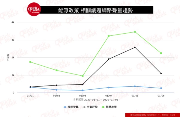 觀察今年以來網友對於「空氣汙染」的討論聲量,1月4日與5日的網路討論確實因為空汙超標而廣受議論。若觀察「能源政策」的網路聲量,也會發現相關討論走勢與空氣汙染相當吻合,顯示網友在討論空氣汙染時,確實會思考台灣能源發展的議題。這次的空汙事件尤其讓網友更聚焦在台中燃煤火力發電造成的能源政策問題,但面對藍營強打的「核能」政策來看,核能發電相關討論並不熱絡,由此可見,燃煤帶來的空污議題同時讓能源討論浮上檯面,但卻不一定導向核能。