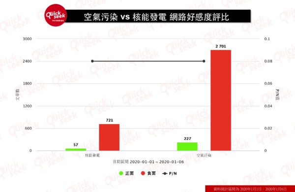 若由議題好感度觀之,也可發現網路討論對於「核能發電」與「空氣汙染」的態度是同等負面的,網路上針對空氣汙染的討論僅在關注產生空汙的能源政策,但並沒有增強網友對核能發電的信心。例如有網民諷刺藍營總統候選人韓國瑜想要讓台灣的核能發電佔25%,但韓卻又在政見發表會說出「核廢料不會放在你家,也不會放在我家」的弔詭論調。此外,也有人指出,明明不少國民黨中南部執政縣市挺風電,再加上新北市長也反核電,但韓陣營卻偏偏要挺核反綠,令人感到矛盾,即使如此,空氣污染是現在進行式,帶來的負面聲量也遠高於核能,確實是值得善加利用的選戰議題。