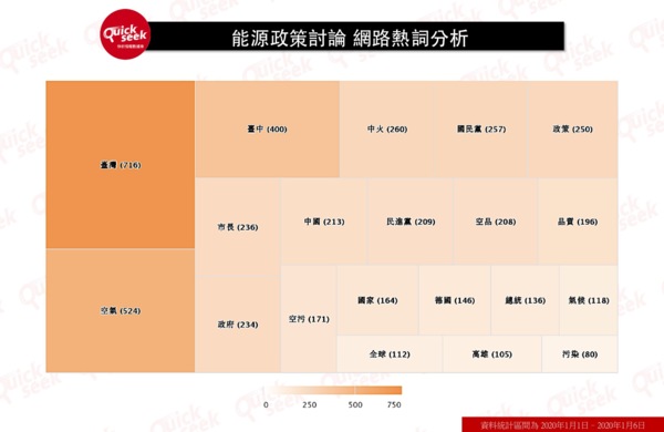 進一步檢視網友近期針對能源政策的討論也發現,近期的能源討論確實與「空氣汙染」有很大的關係,網民對於「臺中」「中火」的討論也相當熱烈,有人認為中火運作已被停照「中國」才是主要汙染源,但也有人認為國營企業應該率先停載,以免惡化「空品」(空氣品質)。藍營想藉機炒作的核能議題並沒有成功在本次空汙、能源議題當中受到熱烈討論。對網友來說,或許提出實質有效的反空汙對策反而比宣傳核能還來的有意義。