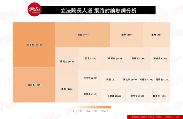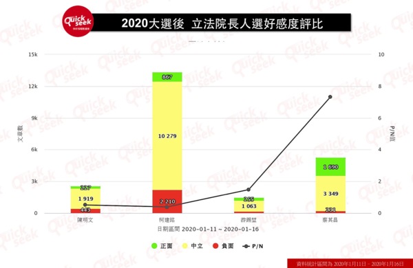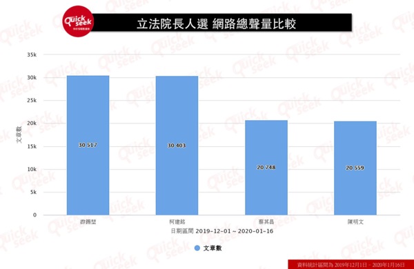 透過QuickseeK分析去年12月至今游錫堃、蔡其昌、柯建銘和陳明文四位民進黨籍立法委員的網路聲量,可以看出明顯以游錫堃和柯建銘兩人的聲量較高,蔡其昌則是到了選後才有「扶正」的聲音,陳明文也被認為從未放棄院長寶座,但本次選得艱辛,出線的機率較不被看好。