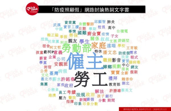 中國武漢肺炎疫情不斷升溫,台灣截至目前雖未出現社區感染病例,但為減少群聚感染的風險,政府決定將高中(職)以下寒假延長兩週,並宣布「防疫照顧假」措施,作為兒童照護問題的配套措施。規定家長一人得請「防疫照顧假」,雇主不得拒絕、不得扣全勤,公務員也不會因此影響考績。然而請假期間不支薪,直接影響勞工薪資,政策一出,網友反應兩極,大多認為請不到,或是不敢請。