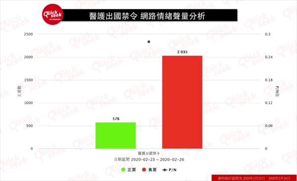 QuickseeK透過正負聲量的監測,發現網友可能對這樣的措施很有意見,有人直言「不懂衛福部為何要跳出來當壞人、把醫護人員汙名化?」「總要共體時艱,卻一次又一次的失望。」在禁醫護人員出國新聞開始報導後,醫界相關人士在社群、論壇發表意見,不少醫護人員假期是半年、一年前就規畫好,臨時發布禁止出國的消息,卻不見配套,而這樣的政策立意,被認為不是為了保護醫護人員的健康,而是擔心他們染病或隔離後人力的短缺,但同樣也有支持政府的民眾,認為醫護人員固然辛苦,但防疫當頭視同作戰,醫護人員更是珍貴資產,假設出國一個禮拜,回來再隔離十四天,等於三個禮拜的人力空缺。