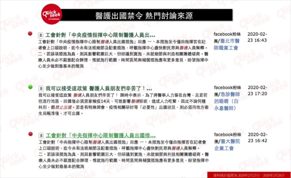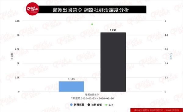 禁醫護出國的措施進一步利用QuickseeK社群活躍度的分析方法,顯示社群論壇互動機制不論是黏著度、討論度,效益遠高於傳統新聞媒體擴散。社群機制讓網友可以針對時事發表自身看法,透過再創相關議題讓輿論更加複雜。像是這幾日,皆有不少醫護人員,在本身社群發表想法。網友分享回應熱烈,又被再製成新聞。針對社群媒體的高度滲透性和傳播力政府需要謹慎以對。