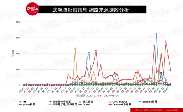根據QuickseeK輿情系統的聲量走勢分析,自一月中旬台灣開始出現疫情後,關於武漢肺炎的假消息,網路討論量日趨升高。初期假訊息主題多為各地出現確診病患,到了二月則以高官染病、偏方治病以及台灣疫情失控等題材為主。甚至也出現過去衛生紙之亂的假訊息翻版,指出增產口罩可能造成衛生紙原料短缺。而在近期網路討論最熱的議題,則是桃園市政府公文遭竄改,捏造「桃園疫情失控要封城」的假消息,引發網友熱議;值得注意的是,依照整體聲量走勢,目前網路假訊息散佈與討論仍持續升溫。未來伴隨疫情狀況,假訊息仍可能層出不窮。
