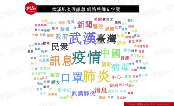 根據QuickseeK的文字雲分析,幾個波段熱門的假新聞關鍵詞,網友反而較少提及,例如假訊息指稱用來掩埋屍體的「大巨蛋」、遭人惡意謠傳有確診病例的「彰化」等,都並未上榜。本次討論最高峰的「桃園封城假消息」中「桃園」一詞的熱度也並不高。反倒是「衛生紙」「原料」以及謠傳偏方的「薑水」、「氰化物」皆上榜,特別是衛生紙一詞熱度相當高。顯示網友最在意與民生相關的假訊息,深怕擴散後民生物資短缺,衛生紙之亂將再起。