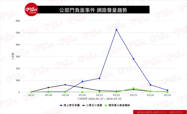 根據聲量趨勢的觀察,自3月17日起,三項爭議話題接連爆出。口罩輸美事件於3月20日暫歇,隨即爆出張上淳兒出國事件,眼見3月23日事件聲量趨緩,週一隨即又出現環保署公務員出國旅遊確診。政府部門近一週除圍堵疫情更忙於為自己滅火,三月下旬儼然成為政府的「危機週」。