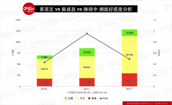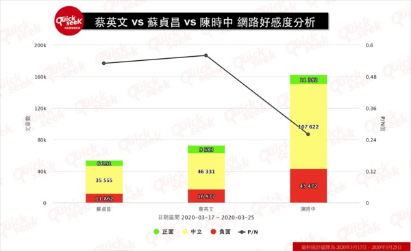 針對蔡英文、蘇貞昌及陳時中三人,在事件前後的正負評聲量進行比對。在事件發生前,以總統蔡英文的正評P/N值最高,指揮官陳時中居次,行政院長蘇貞昌則微幅落後居第三。