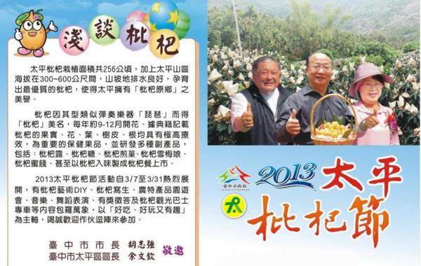 又大又甜的太平枇杷開始上市囉!臺中市太平區公所今(7)日在「磨仔墩」舉辦記者會,宣告「2013太平枇杷節系列活動」即將開跑!除規劃嘉年華等多場精采活動外,副市長蔡炳坤等人也頭戴枇杷帽,為今年特別規劃的「枇杷觀光巴士專車」進行代言,「枇杷巴士」共有5梯次,將帶領民眾暢遊太平,享受「枇杷套餐」,歡迎民眾參加。